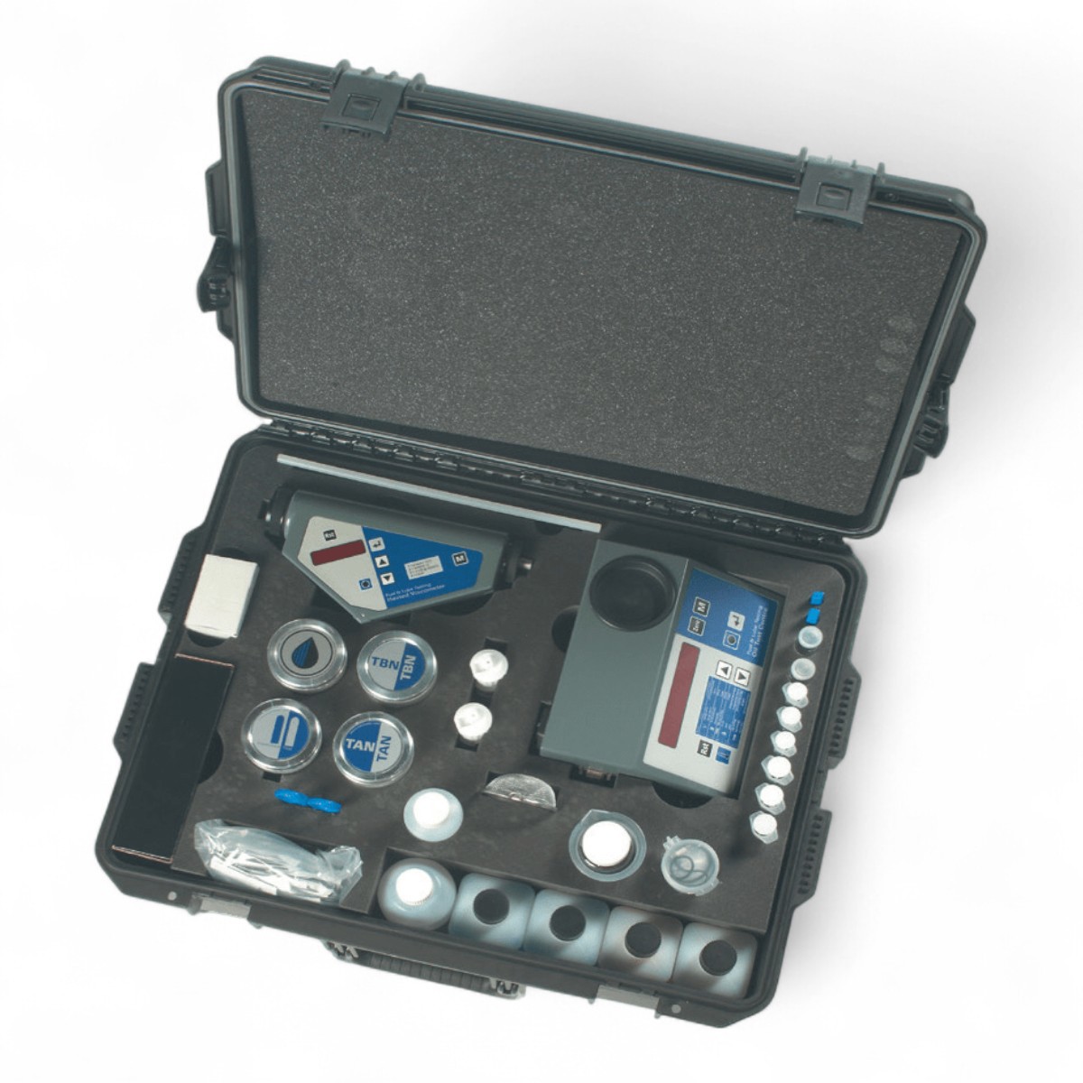 Il Parker OTC opera attraverso una serie di celle di test digitali e strumenti di misura meccanici integrati. L'operatore preleva un campione di olio o carburante e utilizza i reagenti specifici forniti nel kit per avviare i test. La cella digitale elabora la reazione chimica o fisica (come la pressione del gas per l'acqua o la resistenza elettrica) e visualizza il valore direttamente sul display. Per la viscosità, il sistema può includere un viscosimetro riscaldato che normalizza il campione a 40°C, garantendo una precisione comparabile ai test di laboratorio standard.