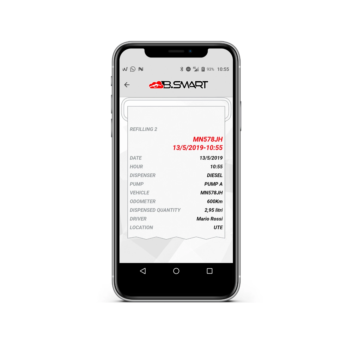 Quando l'autista apre l'app B.SMART sul suo dispositivo mobile, sia iOS che Android, lo smartphone si connette automaticamente al distributore di gasolio PIUSI, permettendo l'erogazione del carburante. Durante il rifornimento, l'autista può monitorare la quantità erogata direttamente sul dispositivo mobile. Al termine dell'operazione, la ricevuta virtuale viene inviata simultaneamente alla Web App, dove il manager può gestirla.
