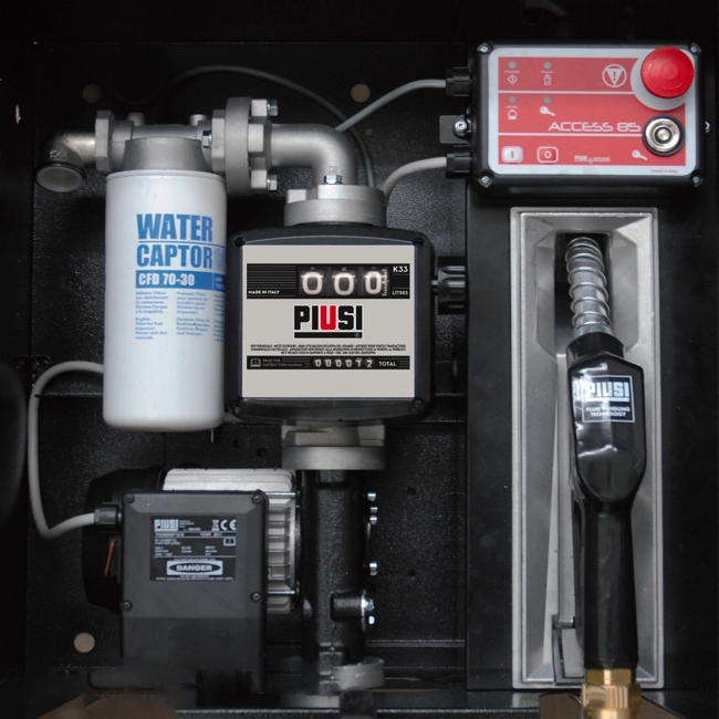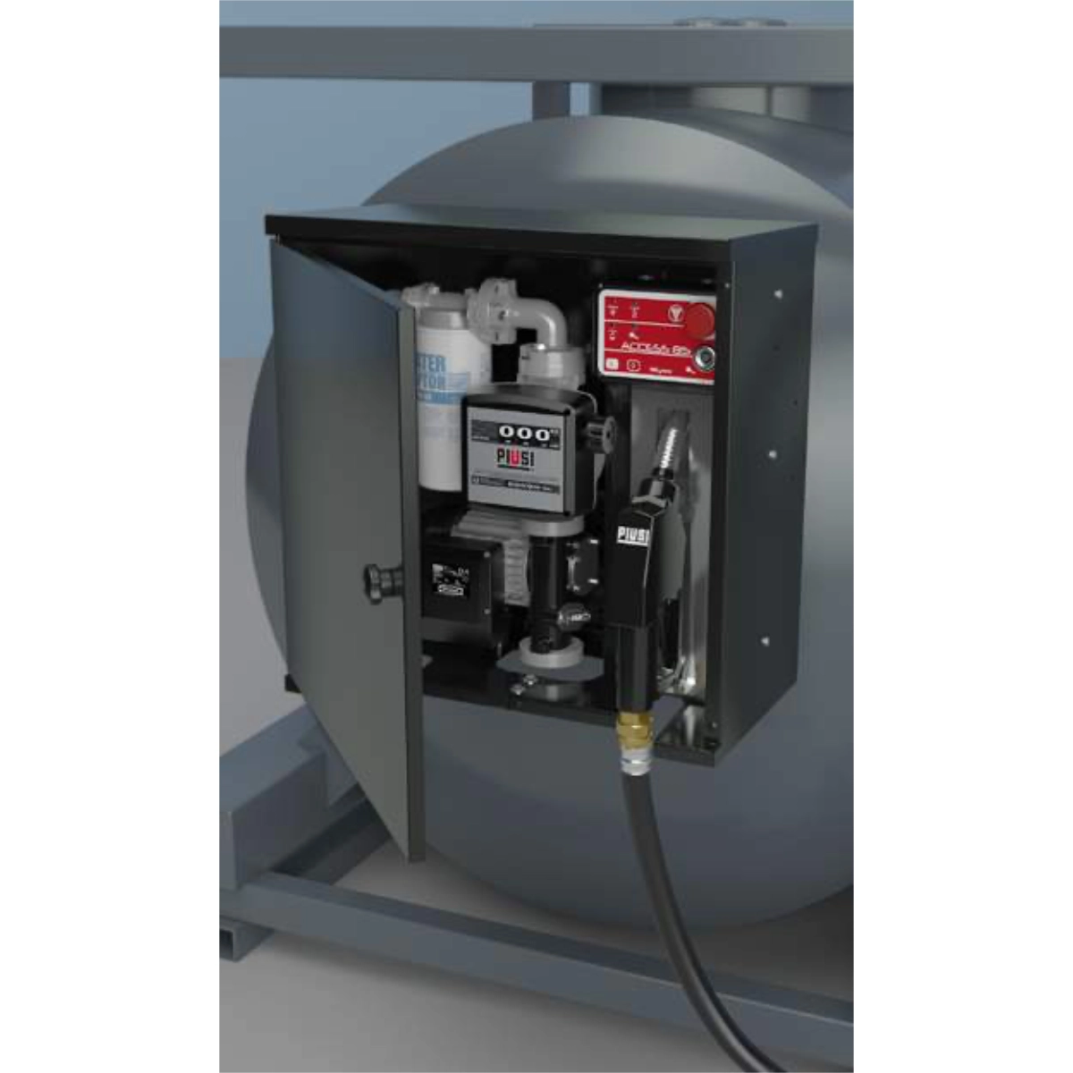 PIUSI ST BOX è una stazione di rifornimento diesel completa di pompa, contalitri e filtro, con box metallico di protezione munito di serratura. Il gruppo è completo di tubo antistatico per diesel e pistola di erogazione automatica. La versione PRO è dotata di centralina elettronica di controllo accessi Access 85.
