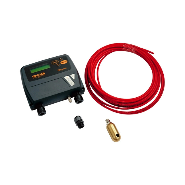 OCIO rileva la pressione statica generata dall’altezza del liquido per mezzo di un tubo introdotto all’interno del serbatoio e visualizza il livello del liquido o il volume. Il sistema è costituito da: