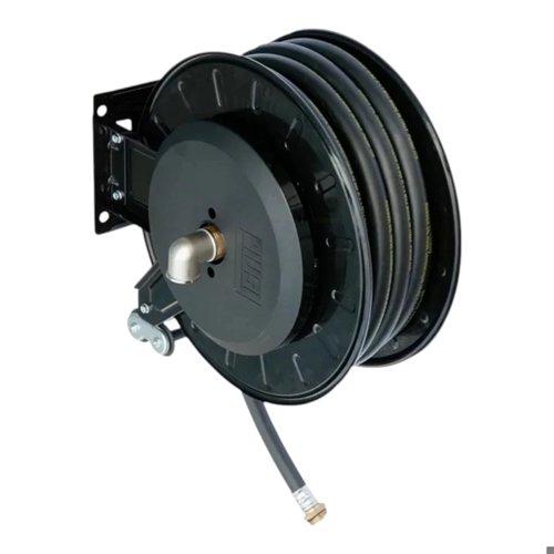 L'arrotolatore sfrutta un meccanismo a molla pretensionata che facilita il riavvolgimento automatico e controllato del tubo. Durante l'estrazione, un cricchetto di arresto permette di bloccare il tubo alla misura necessaria per il rifornimento. Il giunto girevole integrato assicura una rotazione fluida senza strozzature, mantenendo costante il flusso di gasolio anche in condizioni di massima estensione, mentre il sistema a rulli guida-tubo riduce l'attrito laterale.