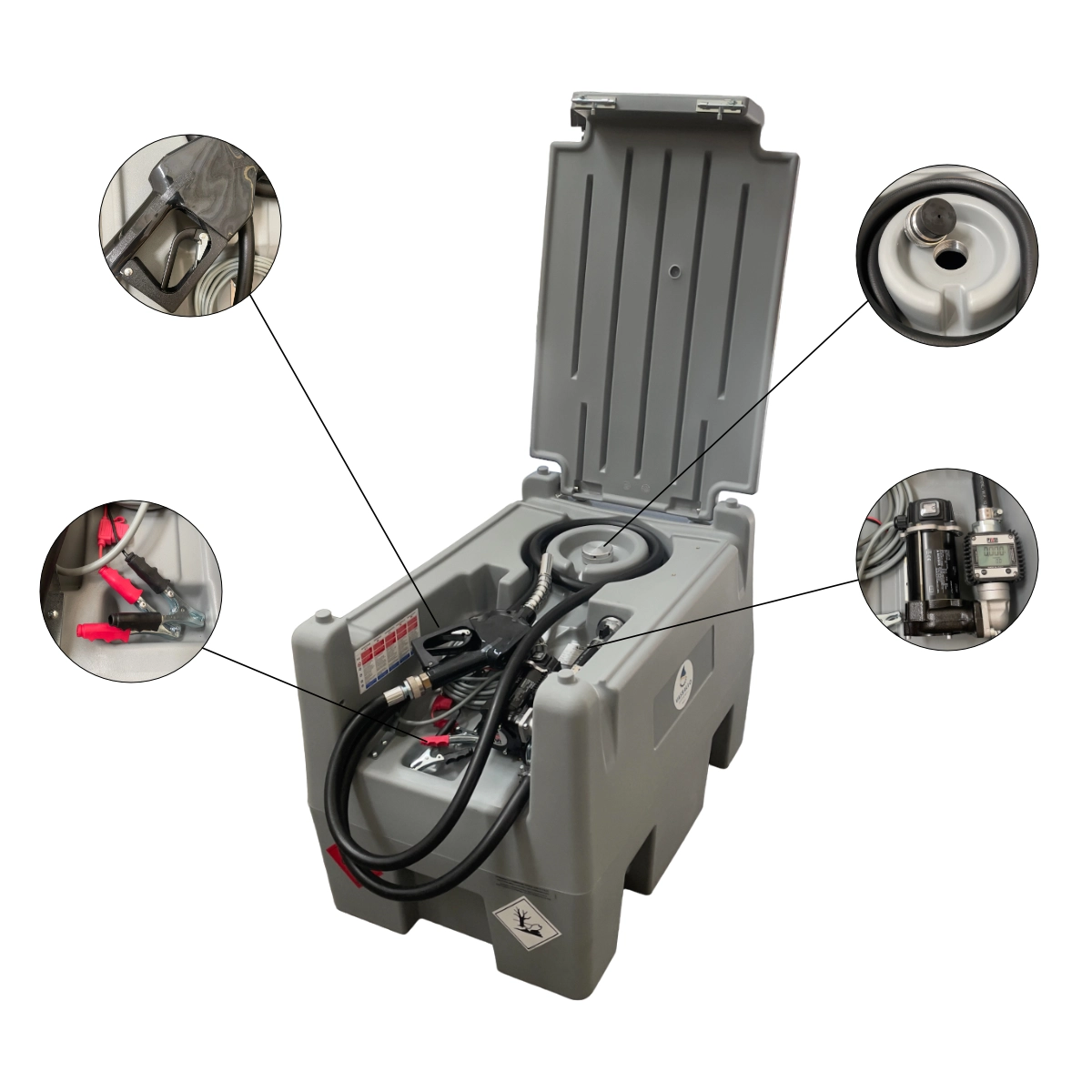 Serbatoio da trasporto in polietilene lineare, dotato di coperchio intergrato che garantisce maggiore protezione, robustezza, trasportabilità e durevolezza. Il System Tank 220 è dotato di tappo di carico in alluminio, valvola di sicurezza, gruppo di travaso PIUSI con pompa da 50 l/min a 12V, pistola automatica , contalitri e 4 metri di tubo per l'erogazione.