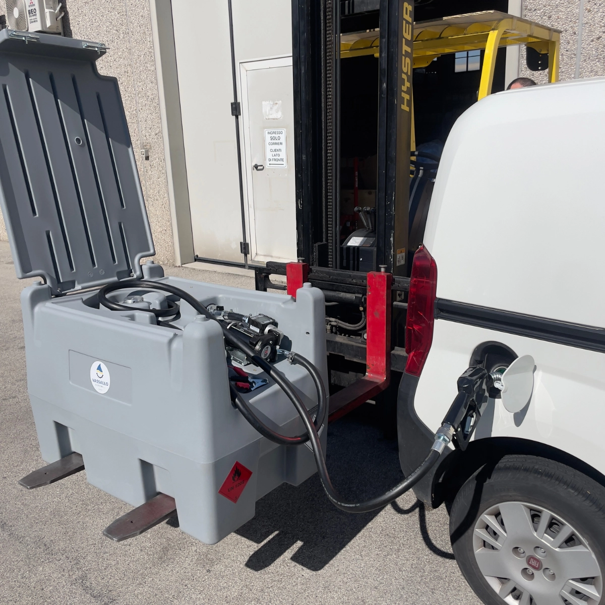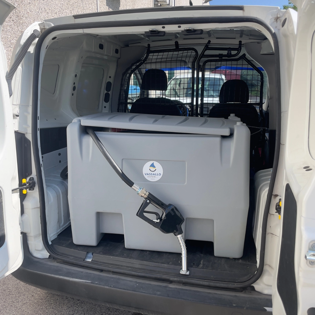 Il serbatoio è dotato di imbocchi per il sollevamento a pieno con forche carrello elevatore, impugnature per il sollevamento a vuoto (24 kg) ed alloggiamenti per posizionamento cinghi di fissaggio al basamento di appoggio. Tutti gli inserti sono realizzati in alluminio o materiale compatibile con il gasolio.