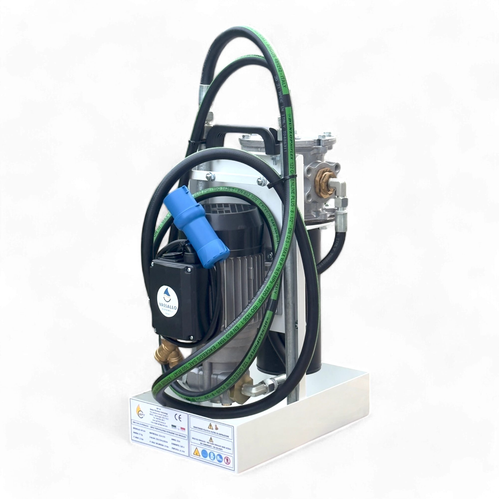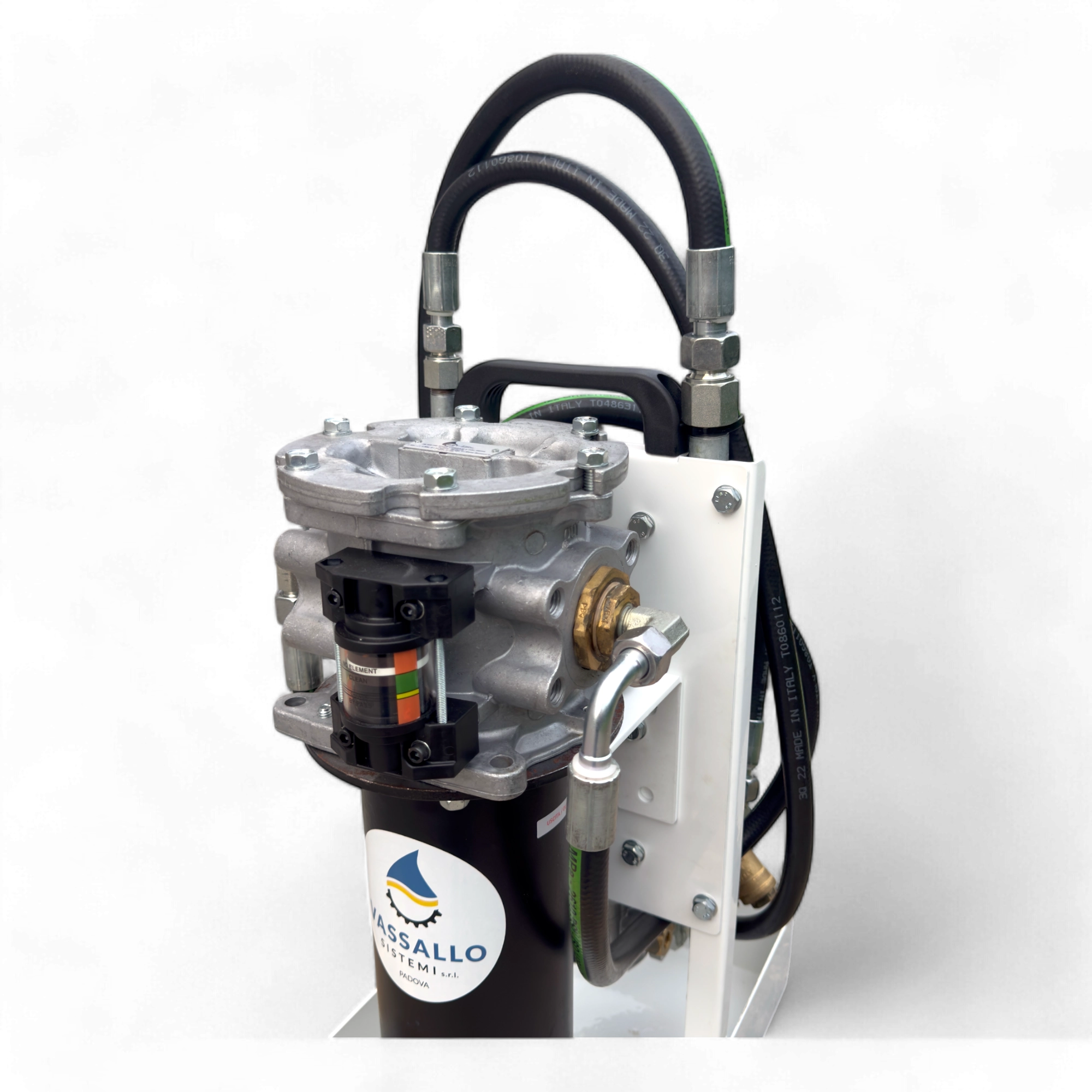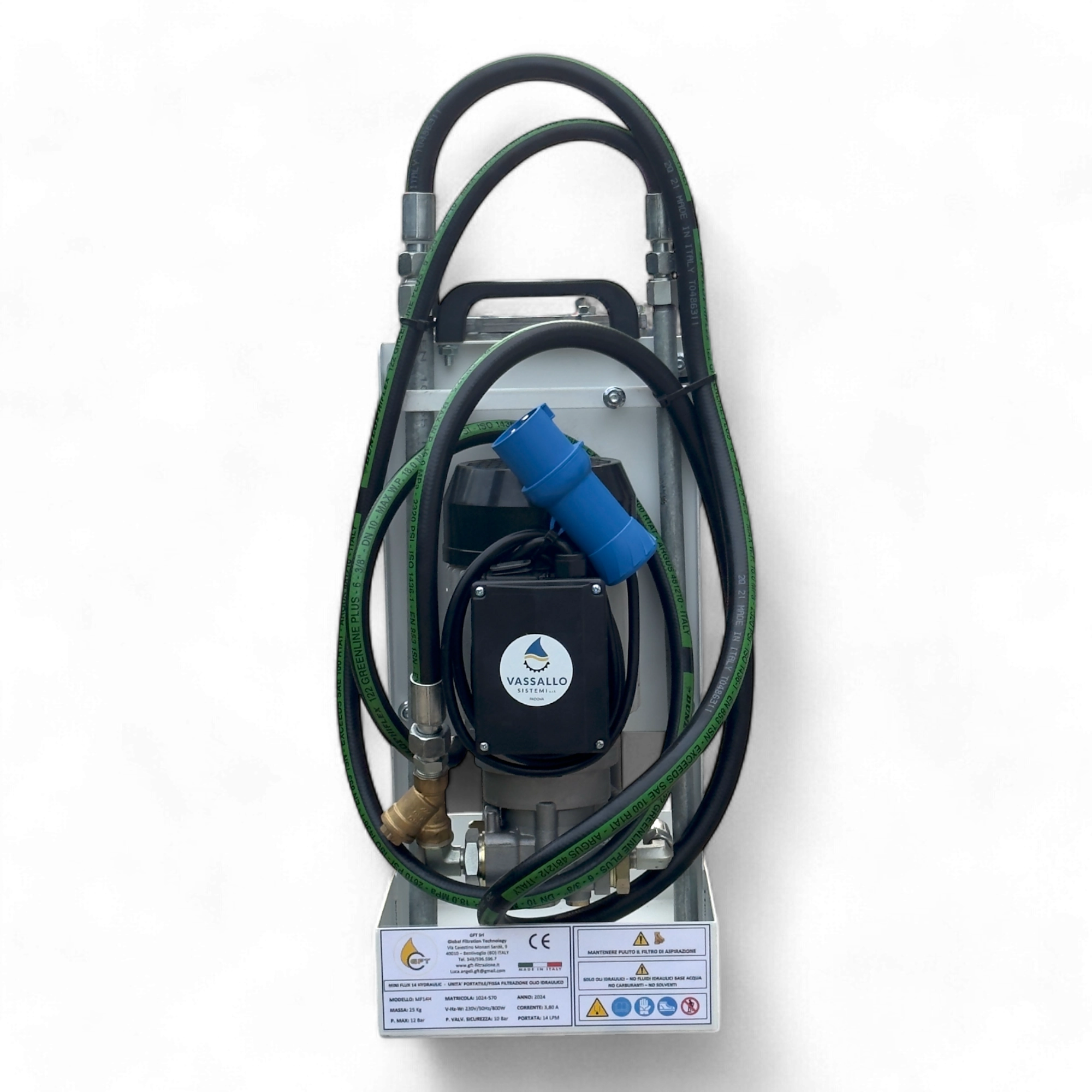 L’unità è completa di maniglia in plastica per il trasporto, vasca di contenimento per evitare spargimenti di fluido attorno l’area di lavoro, filtro con indicatore d’intasamento visivo.
