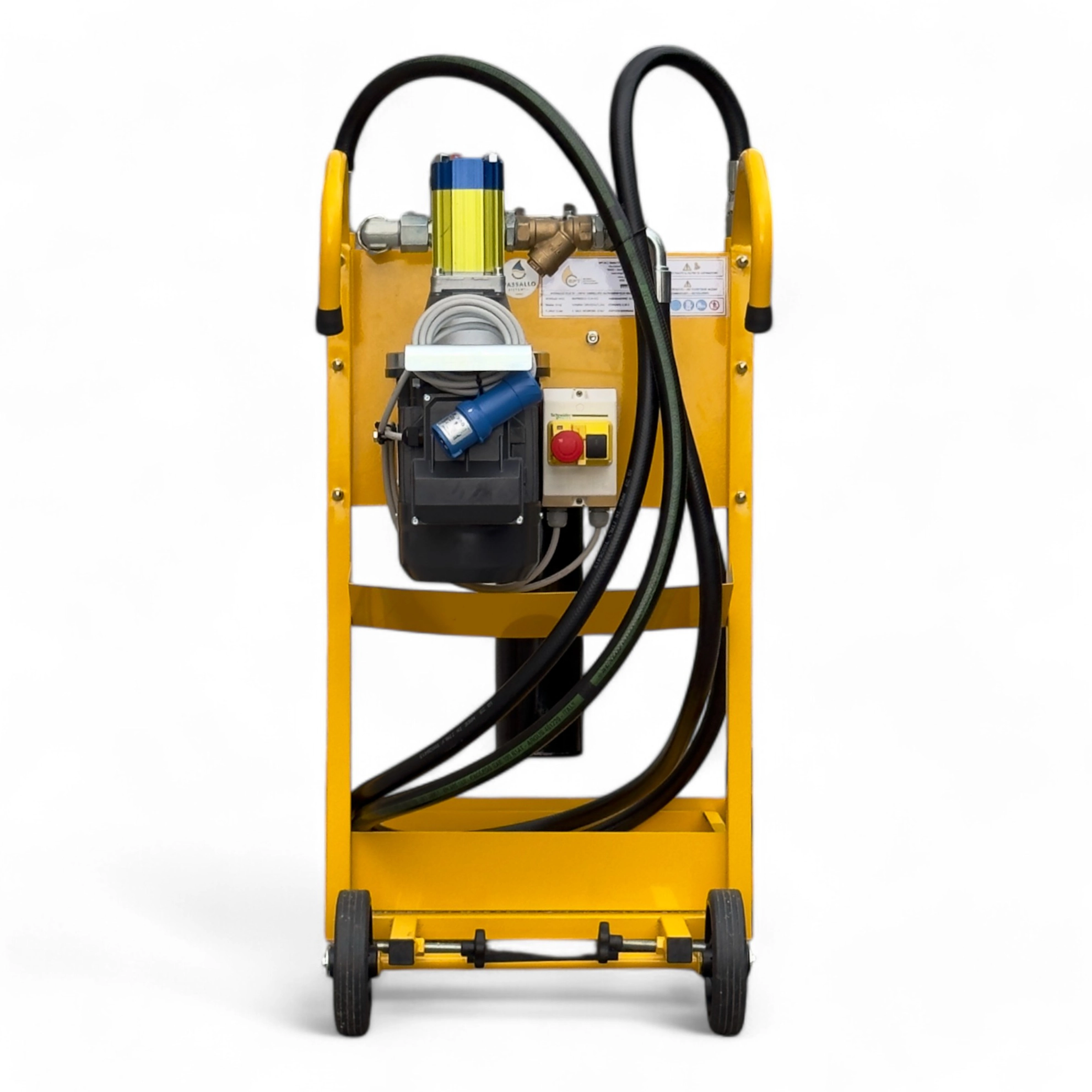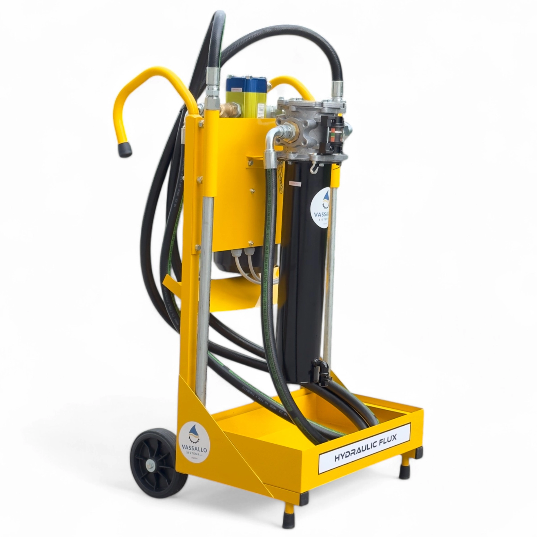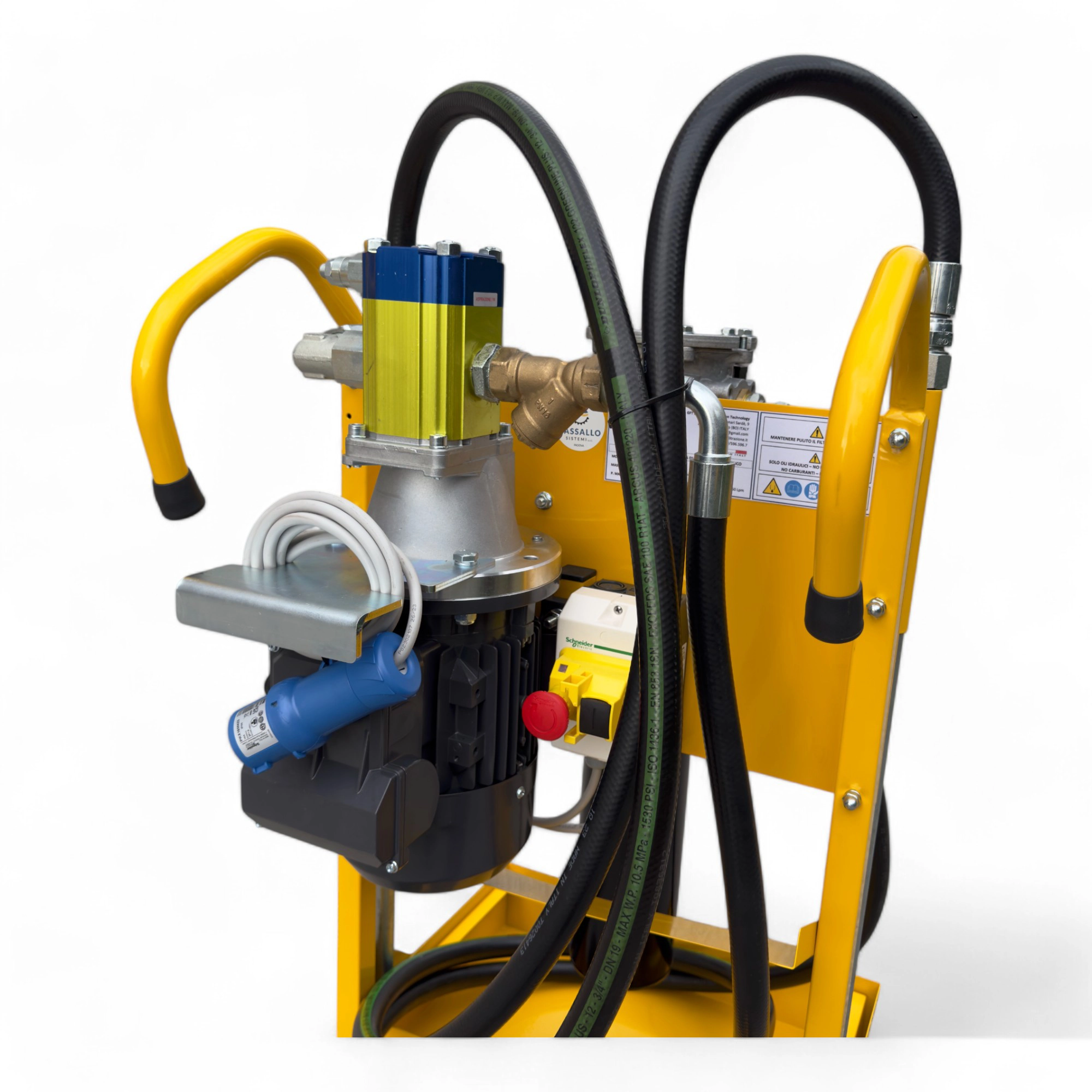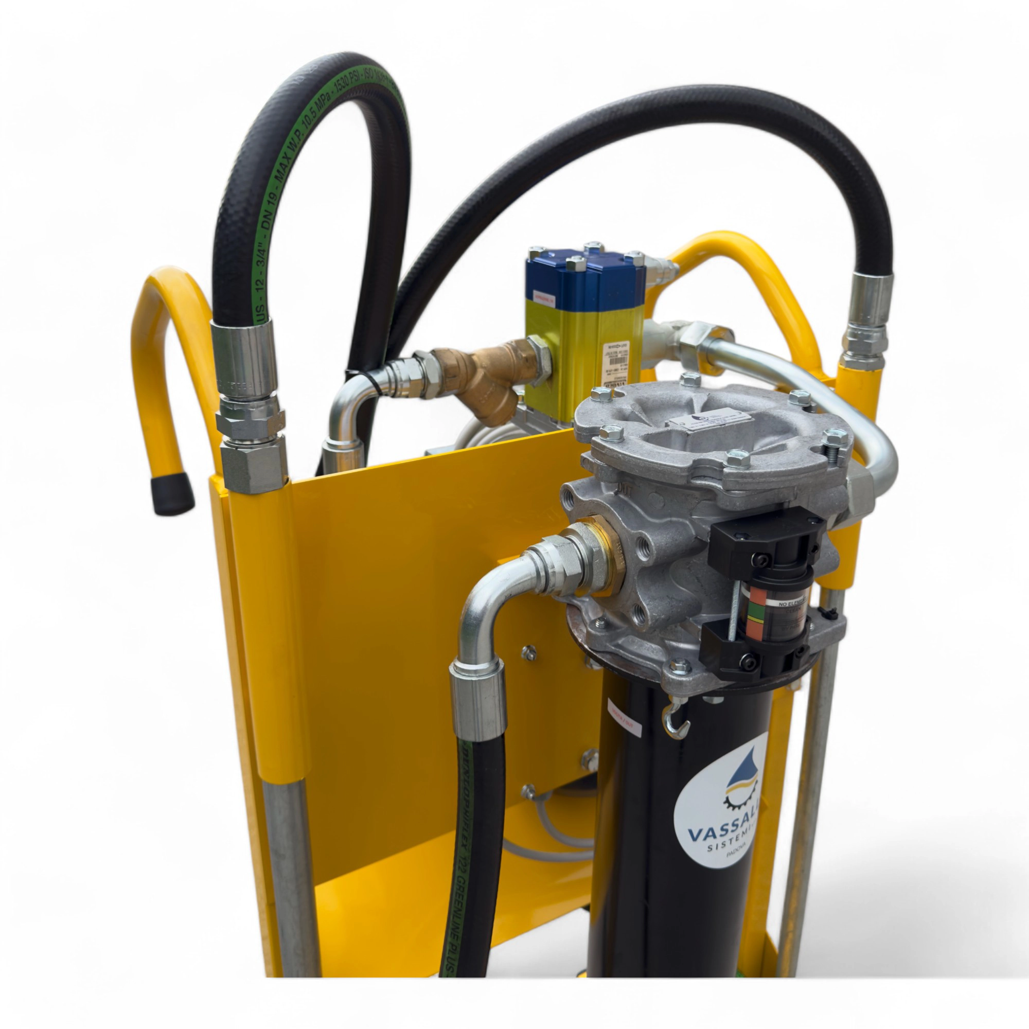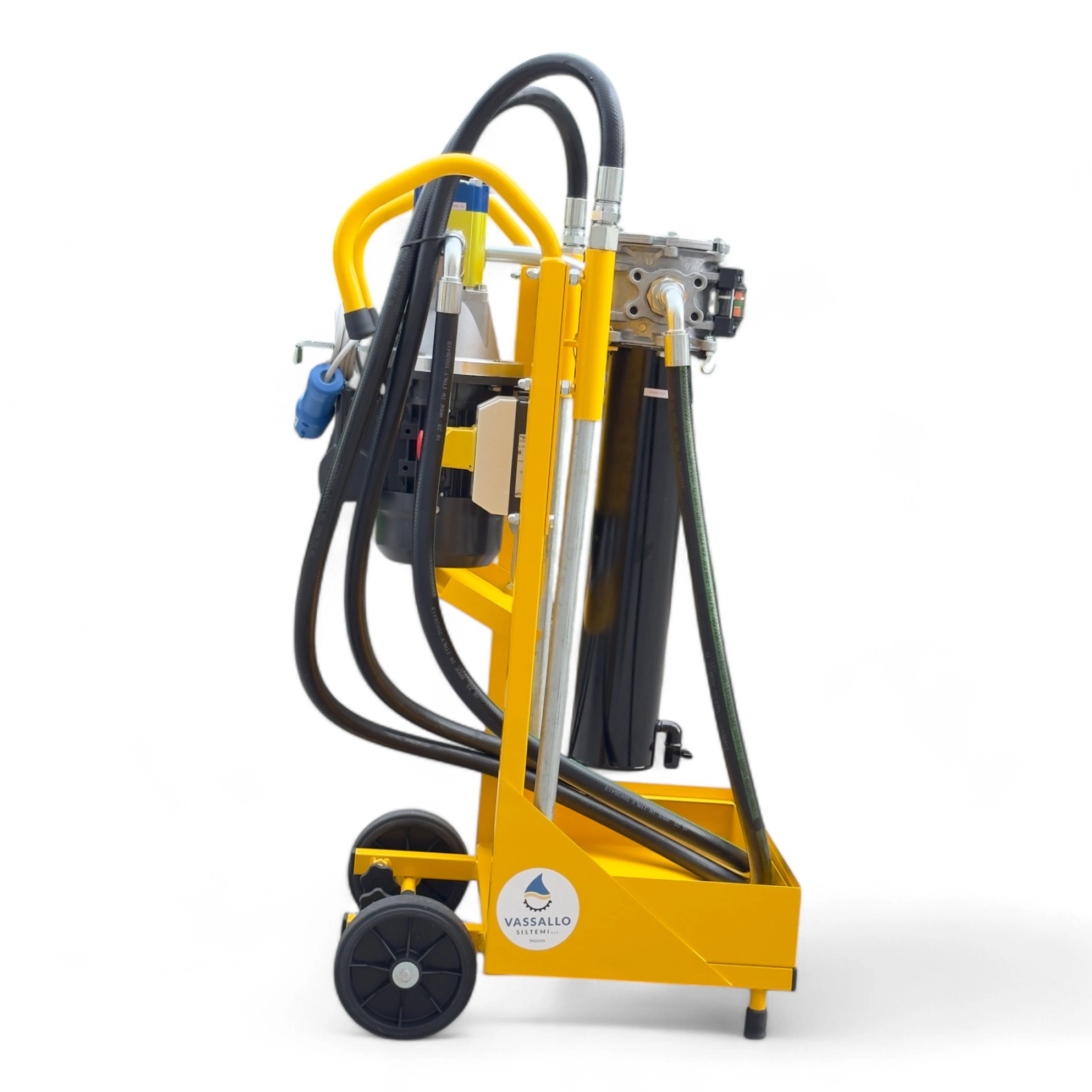 L’unità è completa di comode maniglie in tubo sagomato, ruote con freni, doppia vasca di contenimento (di cui una estraibile) per evitare spargimenti di fluido attorno l’area di lavoro, filtro con rubinetto di svuotamento e indicatore d’intasamento visivo.