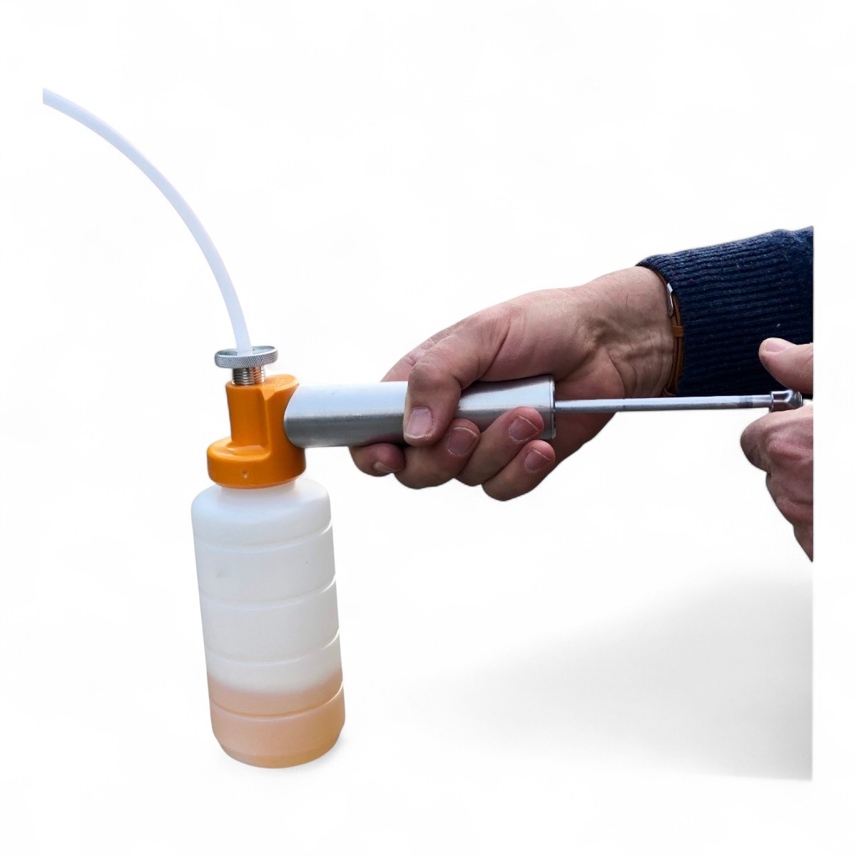 Il sistema è composto da una pompa a vuoto manuale in metallo, progettata per adattarsi perfettamente a bottiglie da 480 ml tramite attacco da 32 mm. Il tubo di aspirazione consente di raggiungere facilmente il punto desiderato all'interno del serbatoio.