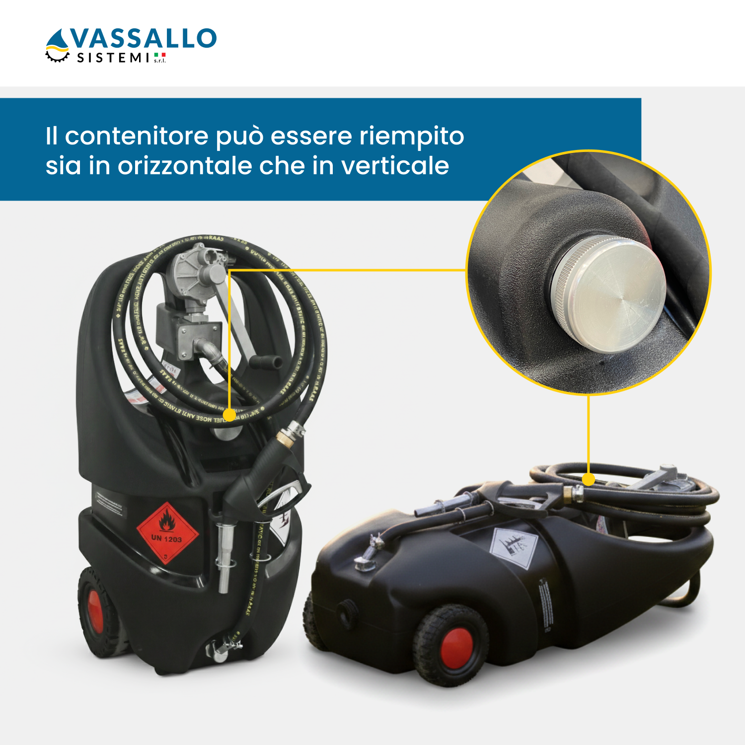 Il MobiFuel Benzina garantisce un'operatività fluida e protetta. Il sistema dispone di un tappo di carico con valvola di sfiato integrata a doppio effetto, che permette l'uscita dei vapori e l'ingresso dell'aria durante l'erogazione. L'operatore può scegliere tra una pompa manuale rotativa in alluminio o una elettropompa ATEX a 12V. Prima dell'inizio delle operazioni, è obbligatorio collegare il cavo di messa a terra integrato. La pistola di erogazione, disponibile in versione manuale o automatica ATEX, permette un controllo preciso del flusso di carburante.