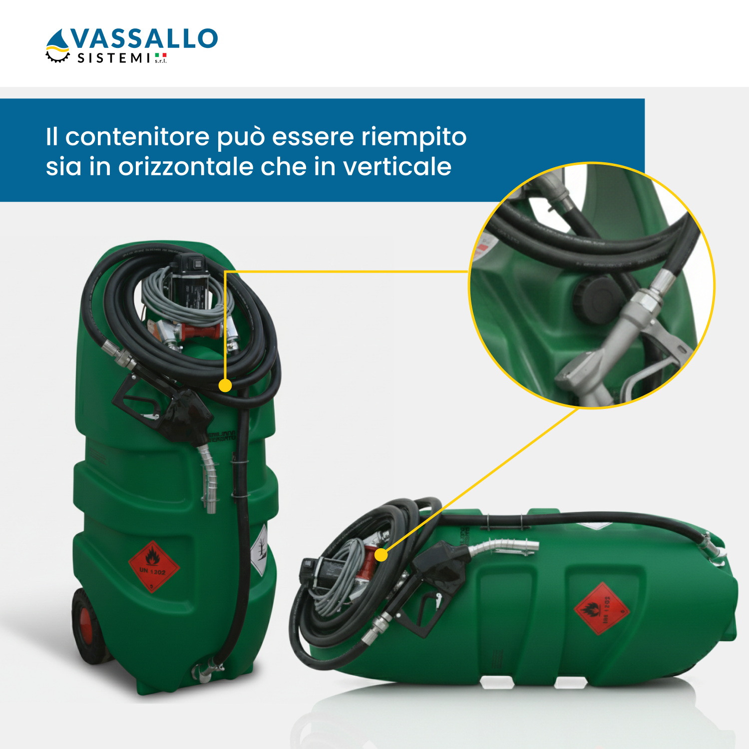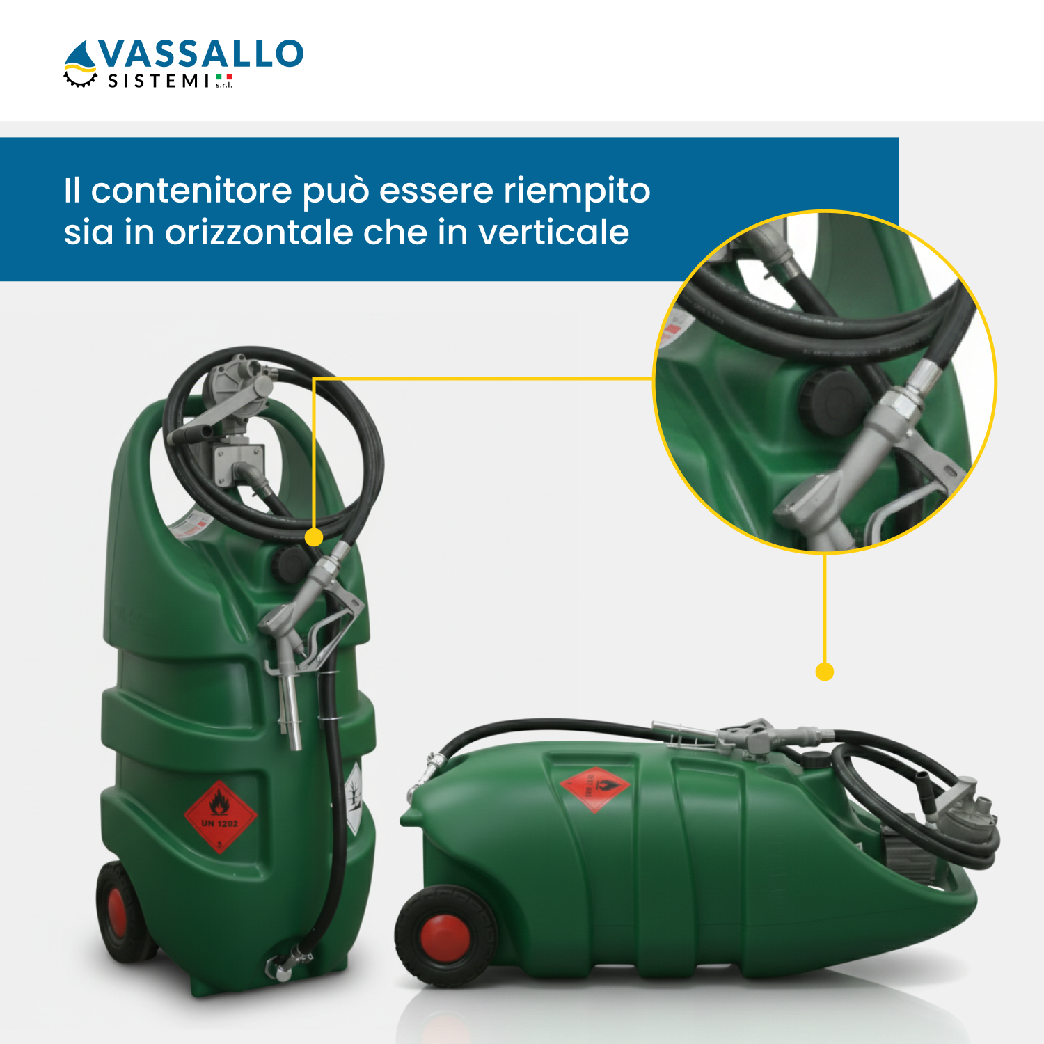 l MobiFuel è progettato per essere operativo in pochi istanti. Il riempimento avviene tramite il tappo superiore dotato di valvola di sfiato integrata per prevenire fuoriuscite. L'erogazione può essere configurata con pompa elettrica (12V o 24V), alimentabile tramite cavo e pinze alla batteria del mezzo, oppure tramite pompa manuale rotativa per la massima autonomia senza energia elettrica. La pistola automatica assicura il blocco del flusso a serbatoio pieno, mentre la paratia interna (nel modello 110) limita lo scuotimento del liquido durante il trasporto.