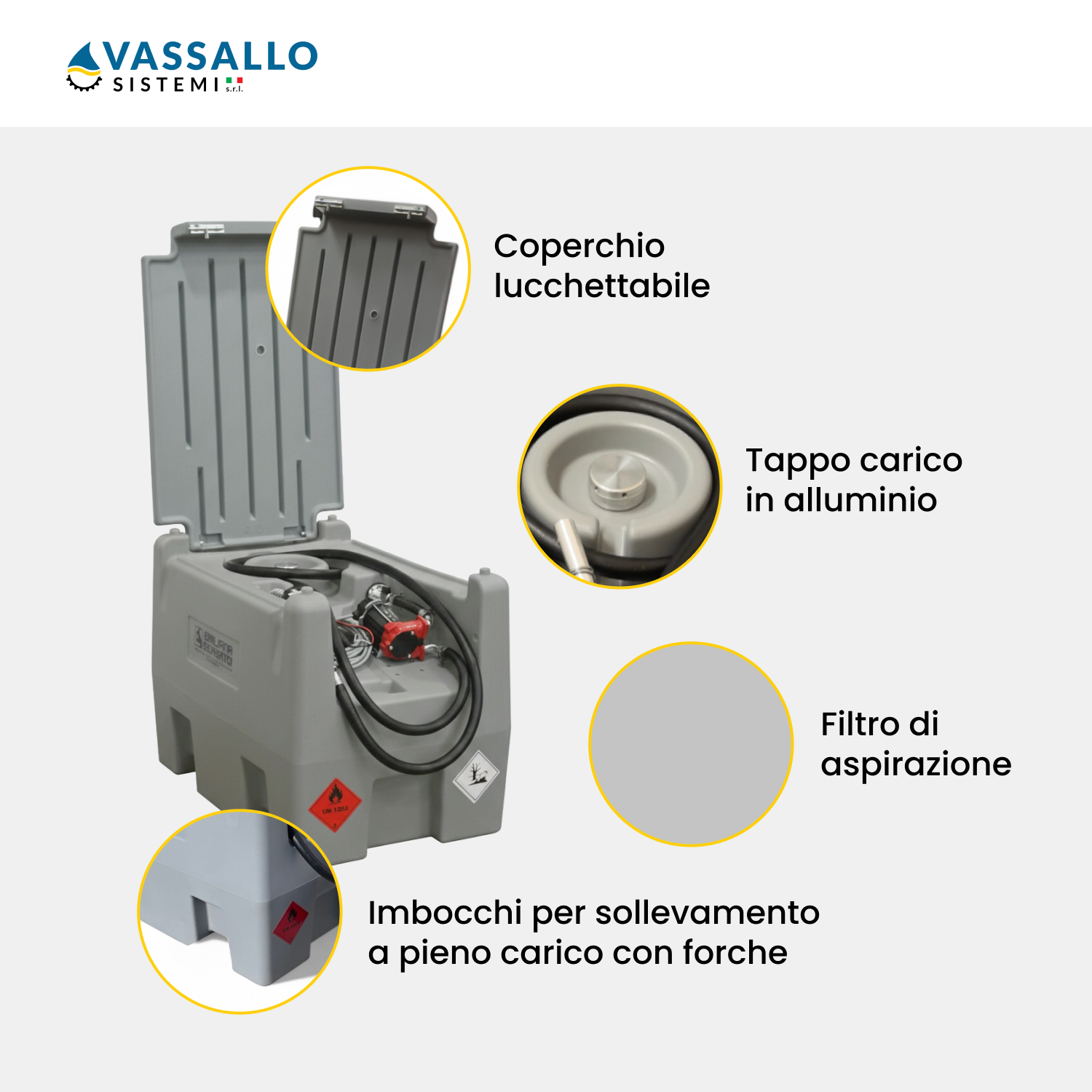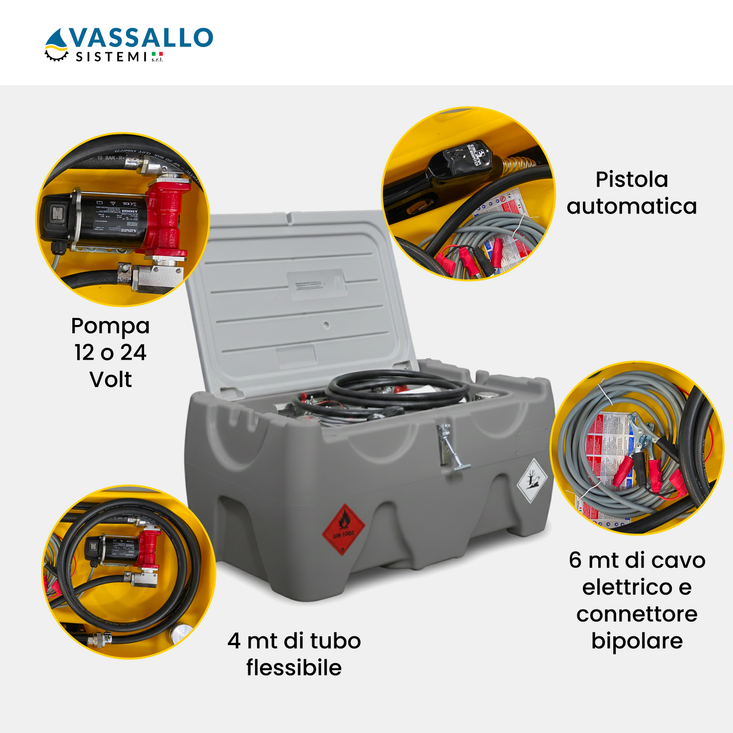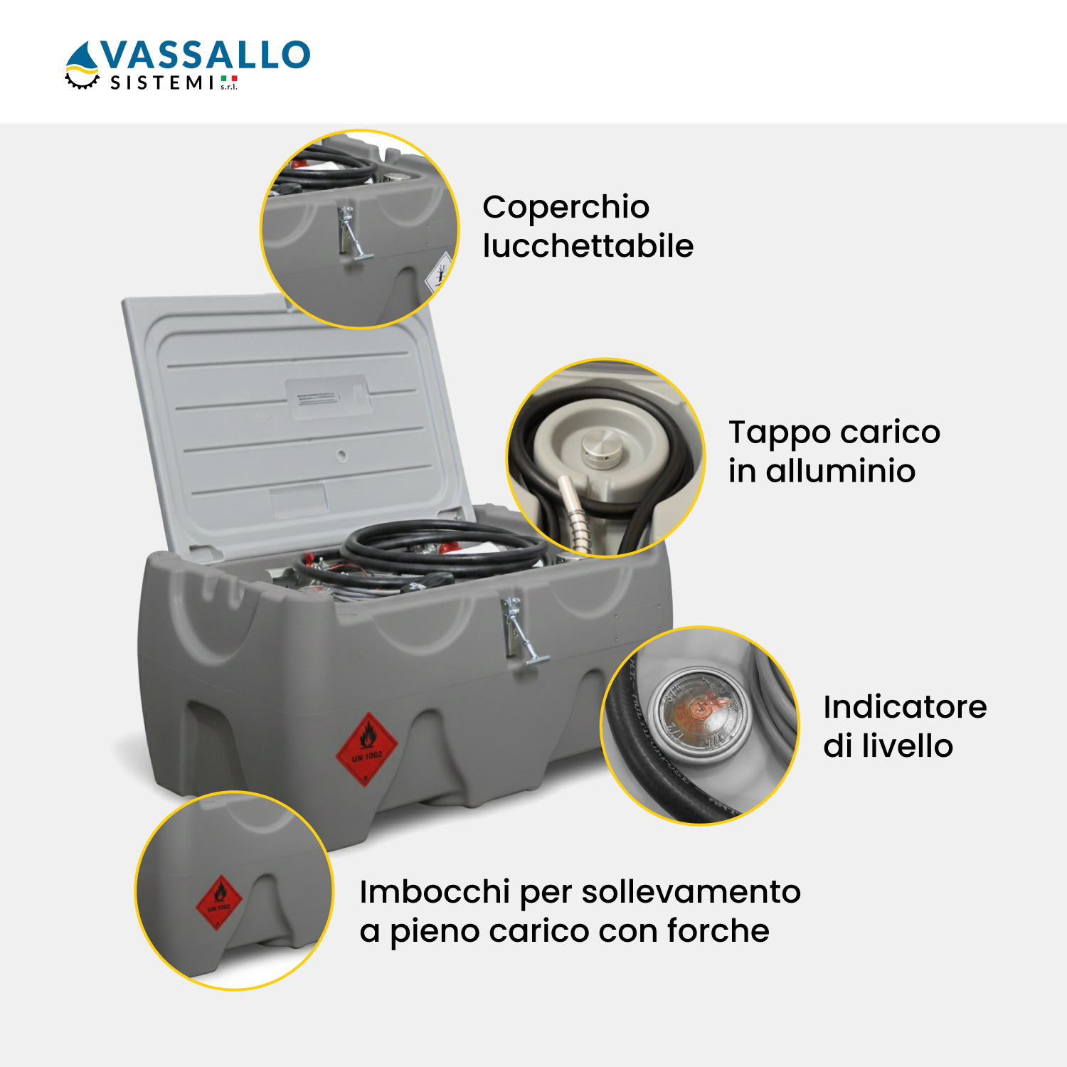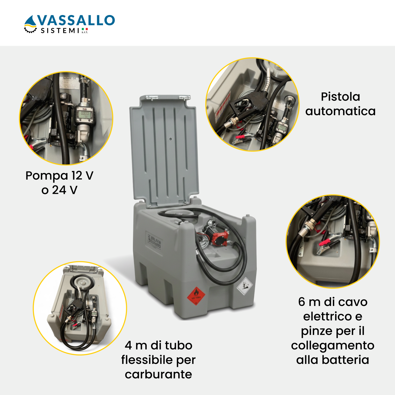 Il rifornimento avviene tramite un gruppo di travaso integrato che include una pompa elettrica (disponibile a 12V, 24V o 230V a seconda del modello). L'operatore collega il sistema alla batteria del veicolo tramite pinze o connettori rapidi, azionando la pompa che preleva il gasolio dal serbatoio attraverso un filtro in aspirazione. Il carburante viene erogato tramite una pistola automatica (che interrompe il flusso a serbatoio pieno) collegata a un tubo flessibile di 4 metri. La sicurezza è garantita da una valvola di sfiato che impedisce sovrappressioni durante l'uso o il trasporto