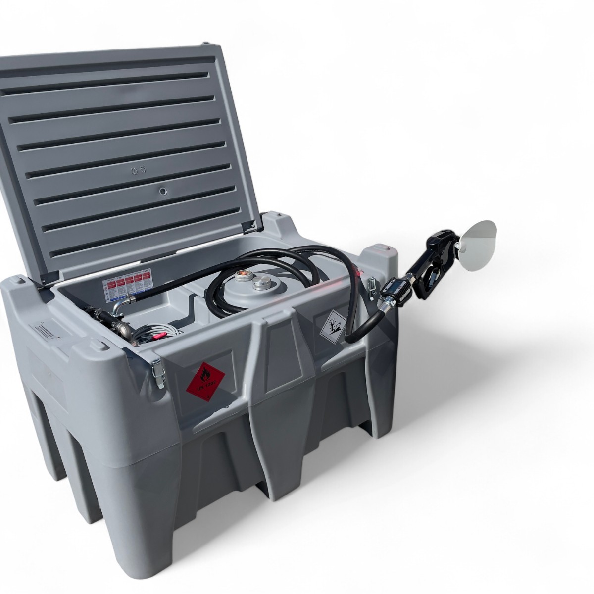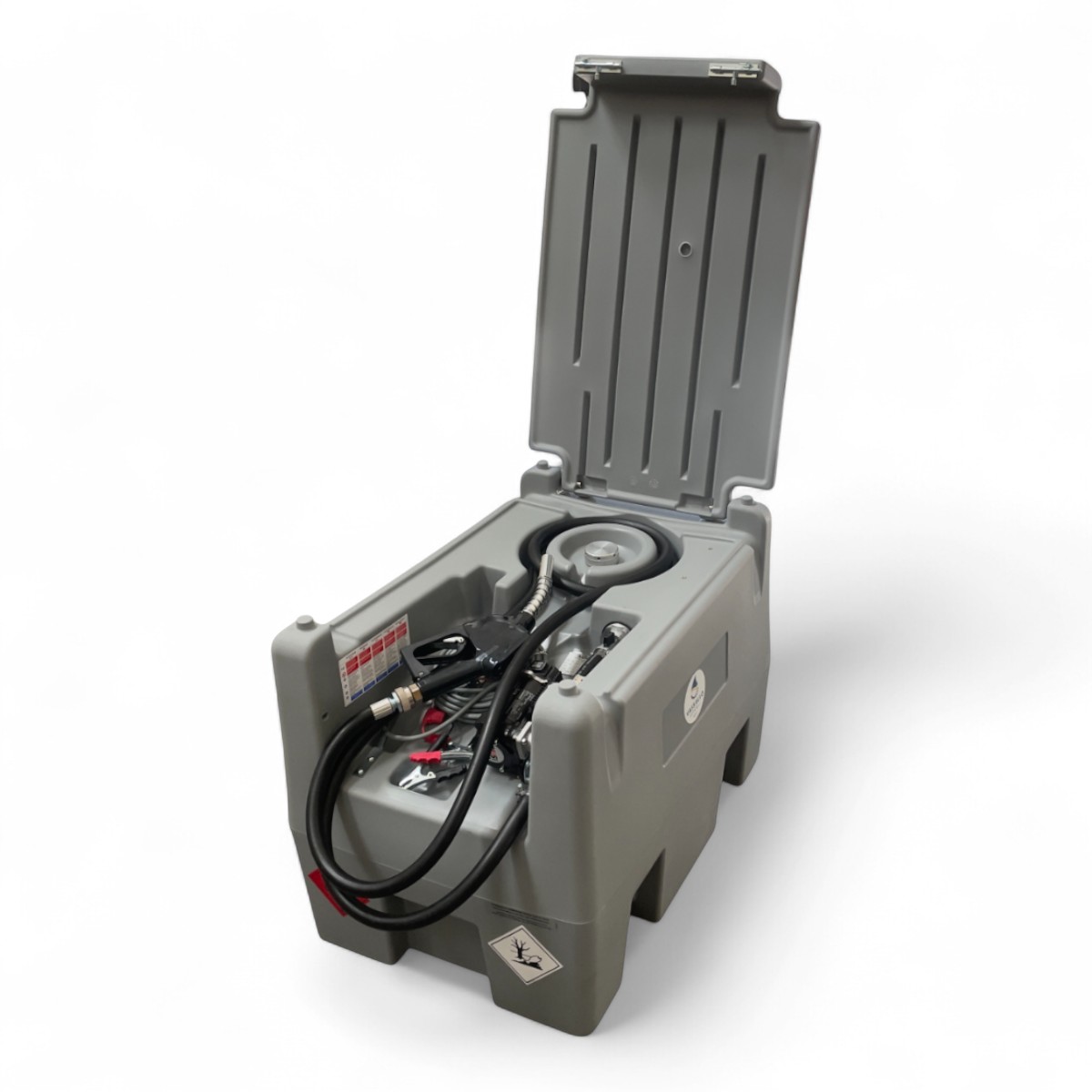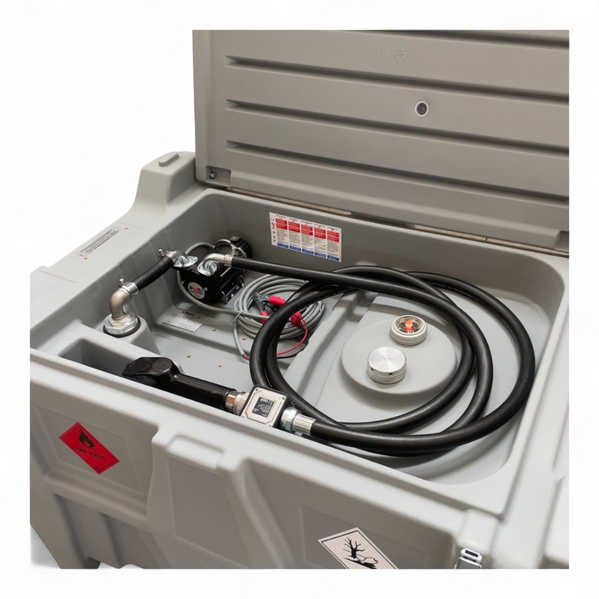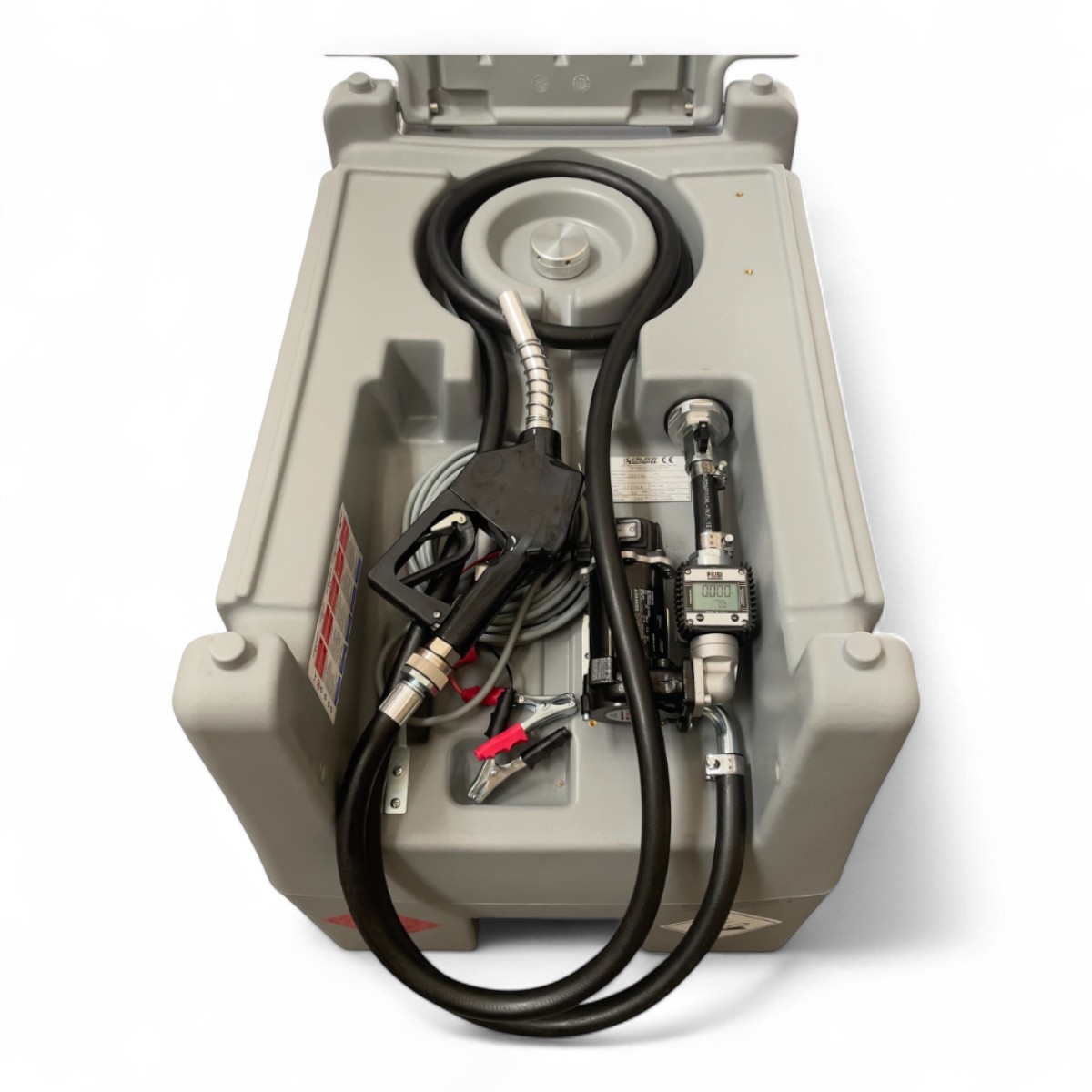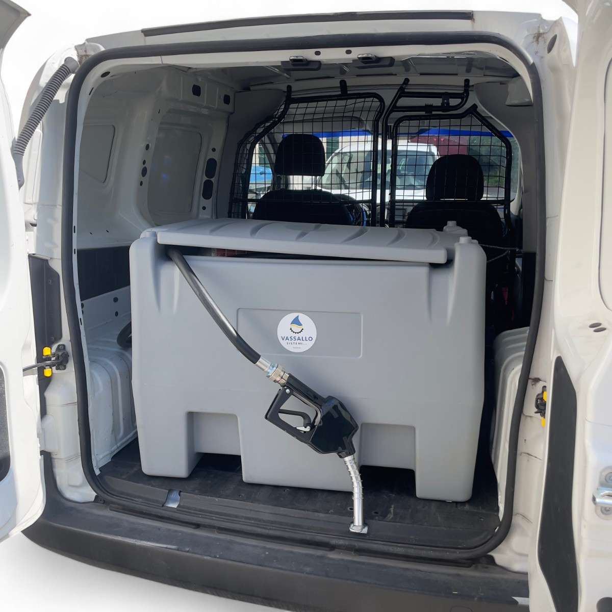 Il rifornimento avviene tramite un gruppo di travaso integrato che include una pompa elettrica (disponibile a 12V, 24V o 230V a seconda del modello). L'operatore collega il sistema alla batteria del veicolo tramite pinze o connettori rapidi, azionando la pompa che preleva il gasolio dal serbatoio attraverso un filtro in aspirazione. Il carburante viene erogato tramite una pistola automatica (che interrompe il flusso a serbatoio pieno) collegata a un tubo flessibile di 4 metri. La sicurezza è garantita da una valvola di sfiato che impedisce sovrappressioni durante l'uso o il trasporto