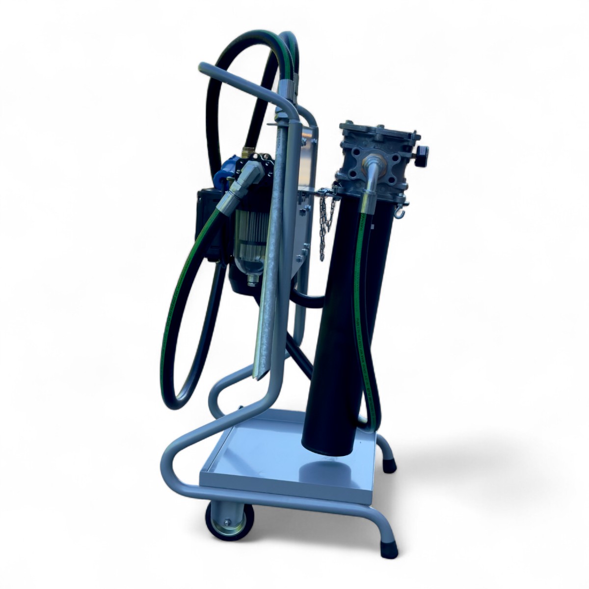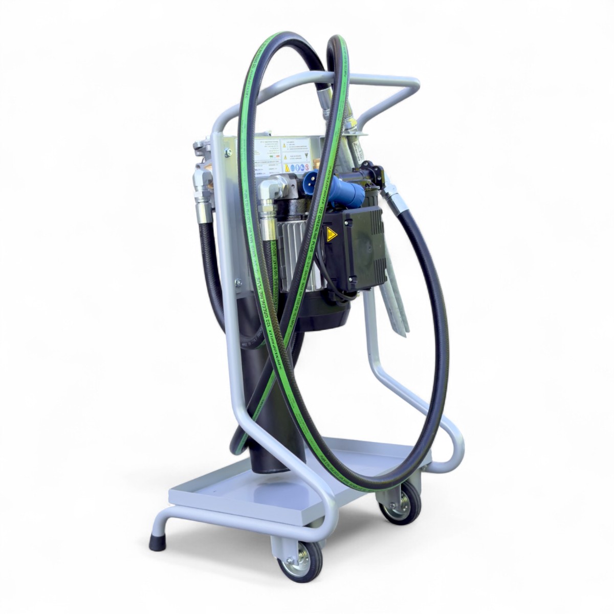 La pompa (elettrica, alimentata 230 V) aspira il diesel da un serbatoio o cisterna. Questo carburante potrebbe contenere particelle solide (ruggine, sedimenti), acqua disciolta o emulsificata, impurità biologiche, ecc.