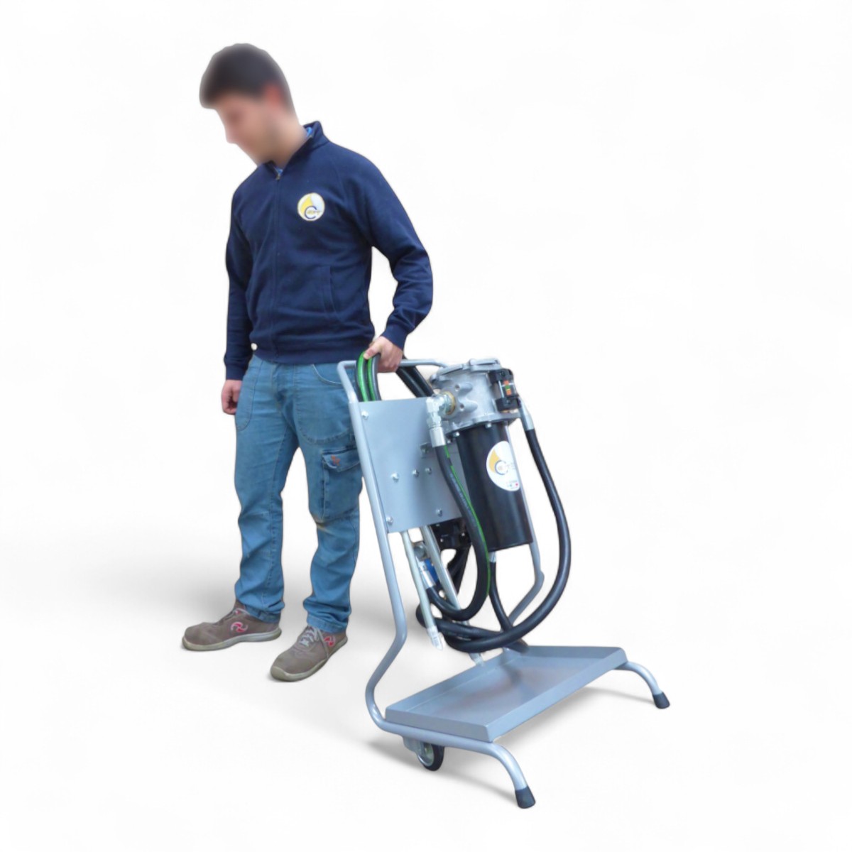 L’unità è completa di telaio in acciaio con manico ergonomico e vasca di contenimento integrata, ruote in gomma ad alta resistenza, filtro lavabile in aspirazione, filtro principale con manometro per il controllo dell’intasamento della cartuccia e tubazioni flessibili in gomma.